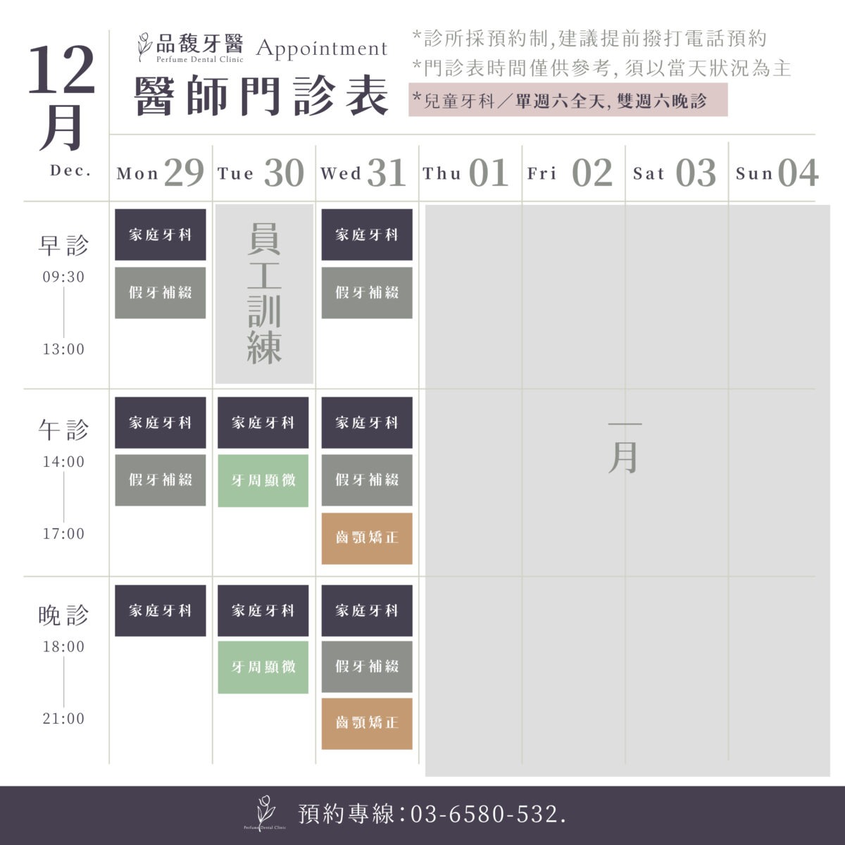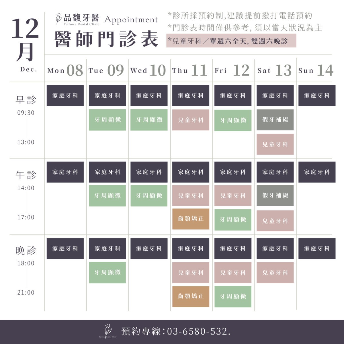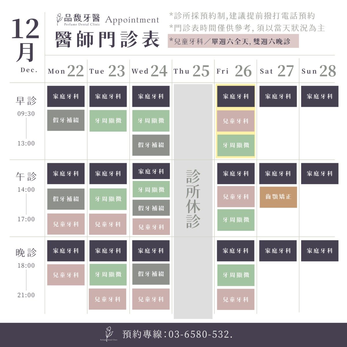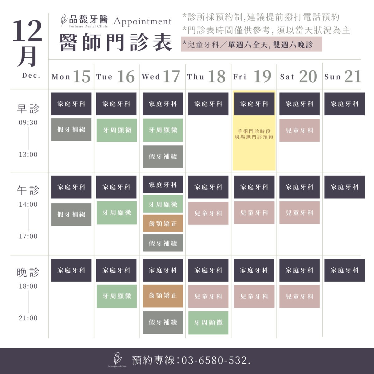 ▪這是11月品馥門診時間呦▪ ・門診表時間僅供參考,還須依當天狀況為準。 ・診所採預約制,建議提前撥打電話預約😎 提醒: ・黃色底為手術門診時段,現場無門診預約 ・兒童牙科/單週六全天,雙週六晚診 ・假牙補綴科/雙週六早午診 ・齒顎矯正專科/固定週三午晚診 (門診時間僅供參考 建議提前撥打電話預約)...